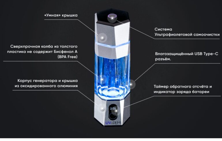 Также многие пьют воду прямо из бутылки UVePEM , из-за чего патогенные микробы могут попадать на электроды и мембрану. Мы услышали Вас и внедрили систему самоочистки воды с помощью комбинированного УФ излучения А и С диапазонов, которая позволяет избавиться диапазонов, которая позволяет избавиться от 99% вирусов, бактерий, патогенных микроорганизмов и плесени внутри бутылки